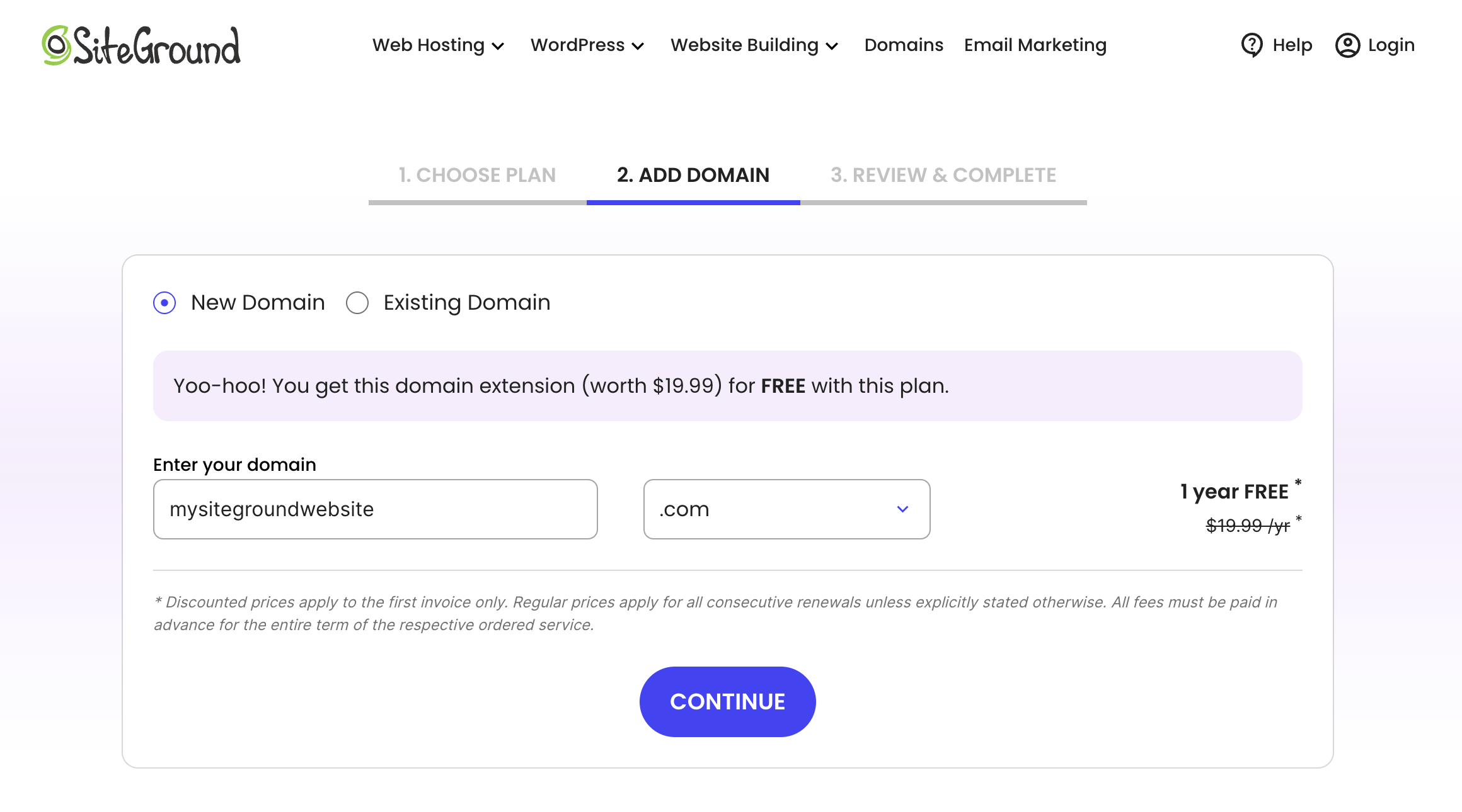 Once you have chosen the best plan for your needs, you can register a domain name or simply enter an existing one you want to use.
