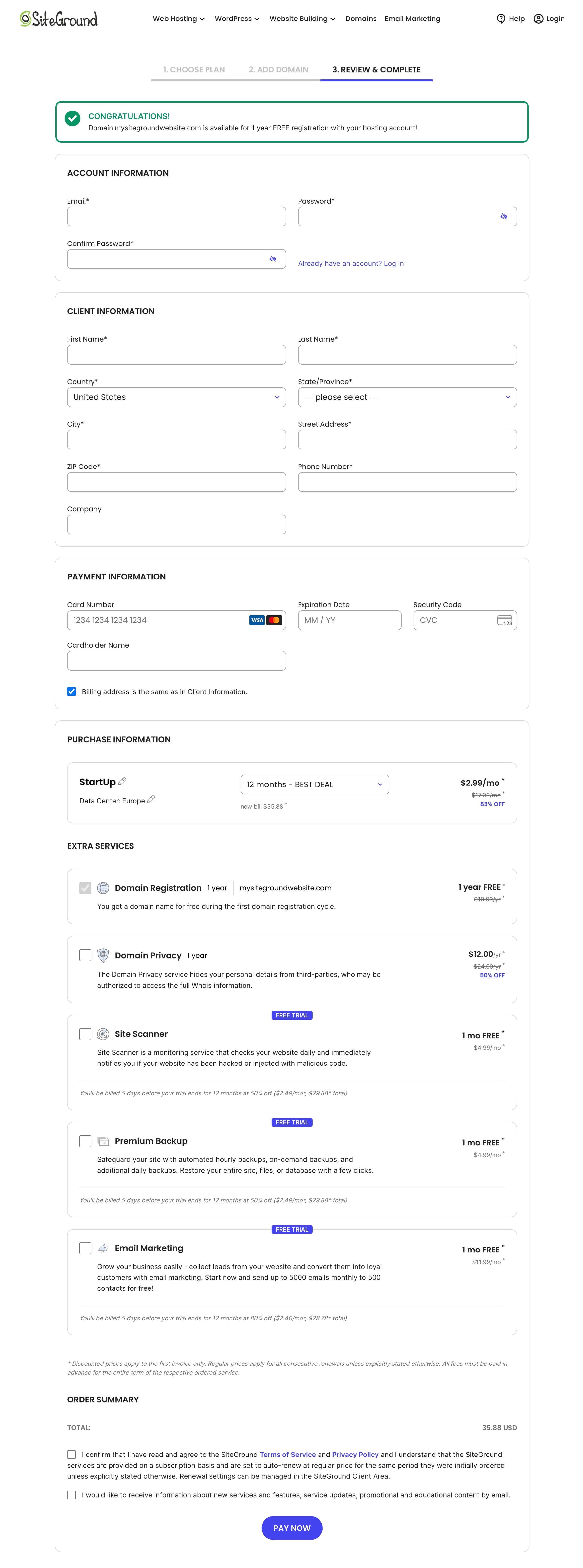 This is where you review your plan and domain before completing your purchase. It is a very straight forward page where account and payment info is entered and relevant extras can be chosen as well.